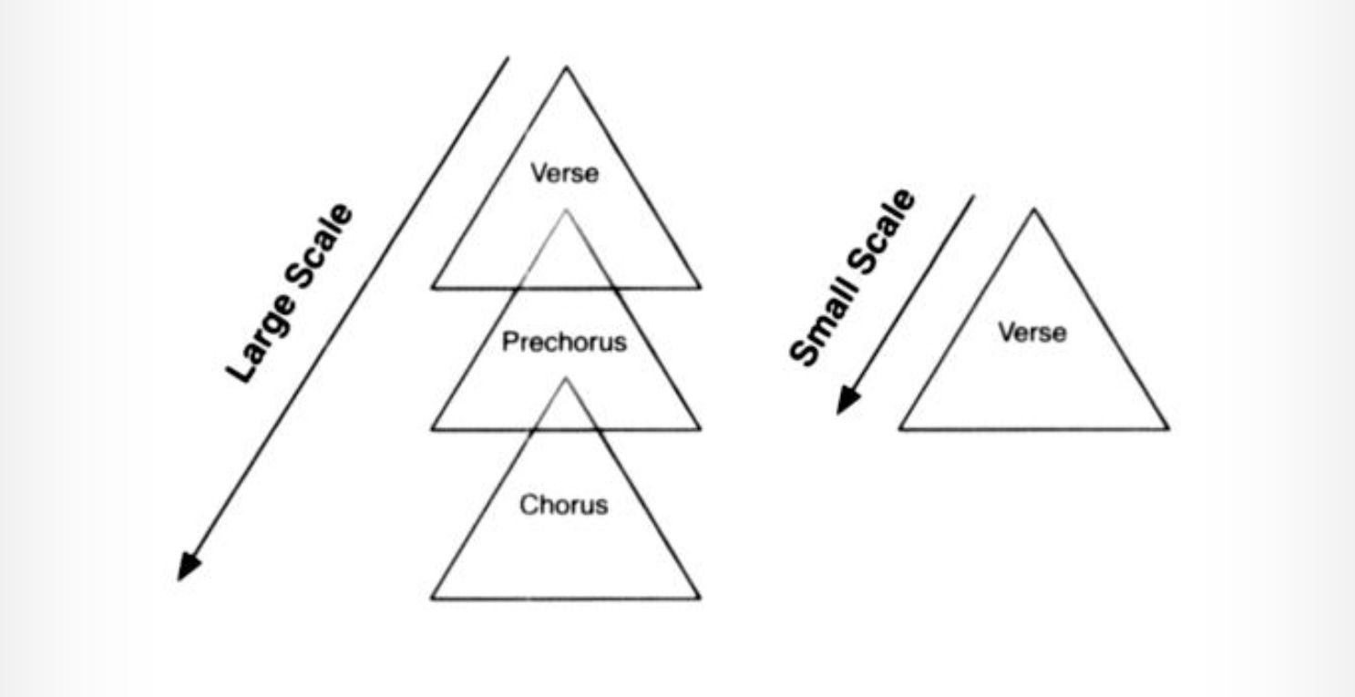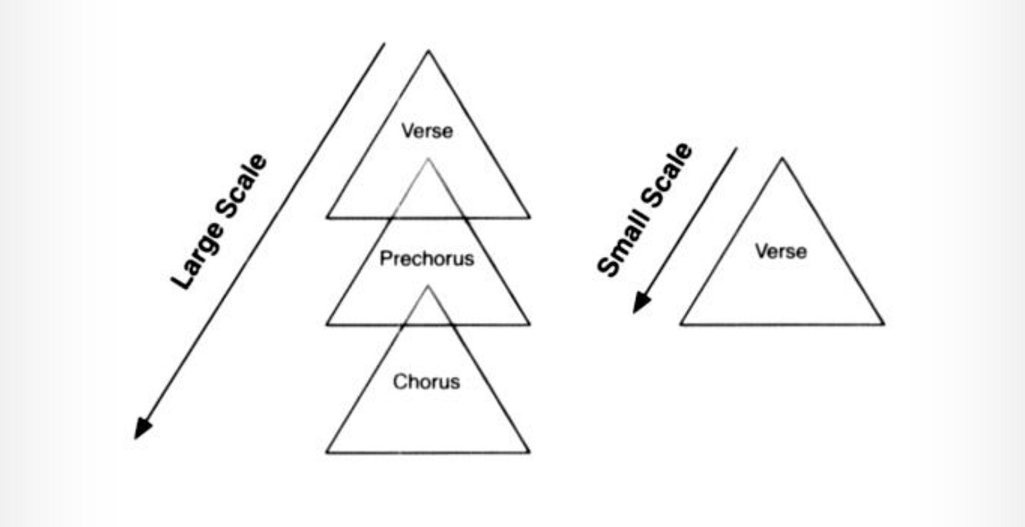 Large-scale pyramiding refers to the overall song structure and how information unfolds as the song progresses through the verses, pre-choruses, and choruses. This approach creates a sense of momentum and direction, making the song move forward. It keeps the listener engaged as the story unfolds, providing a sense of anticipation and satisfaction when the song reaches its climax or hook.