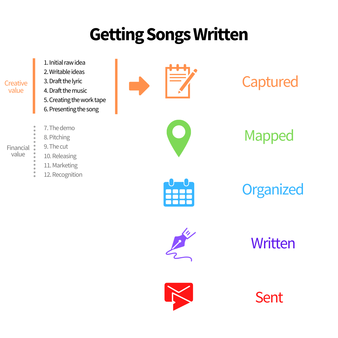 It's the difference between writing songs using random chaos versus writing with organized, productive, and purposed crafting. This aim is to try and put some order into our creative lives.